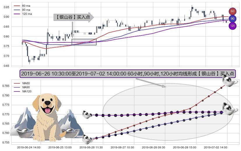 形态多维评估: ⚀ 2019-06-26 11:30:00-小时至2019-07-02 14:00:00-小时显现 60小时-90小时-120小时均线 【银山谷】买入点 看多信号,后市看涨,买入