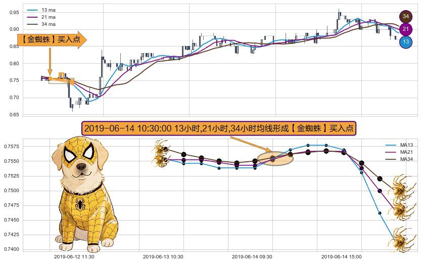 形态多维评估: ⚀ 2019-06-14 10:30:00小时显现 13小时-21小时-34小时均线 【金蜘蛛】买入点 看多信号,后市看涨,买入