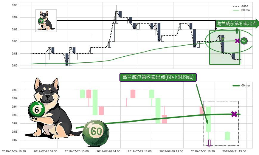 形态多维评估: ⚀ 2019-07-31 09:30:00-小时显现 葛兰威尔均线 60小时均线 第⑥卖出点 走势反转见顶信号,后市看跌,卖出信号