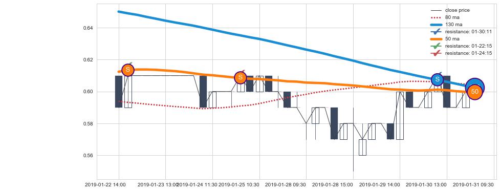 下跌趋势01-21 11:30-01-31 09:30,均线130, 50确认关键阻力3处