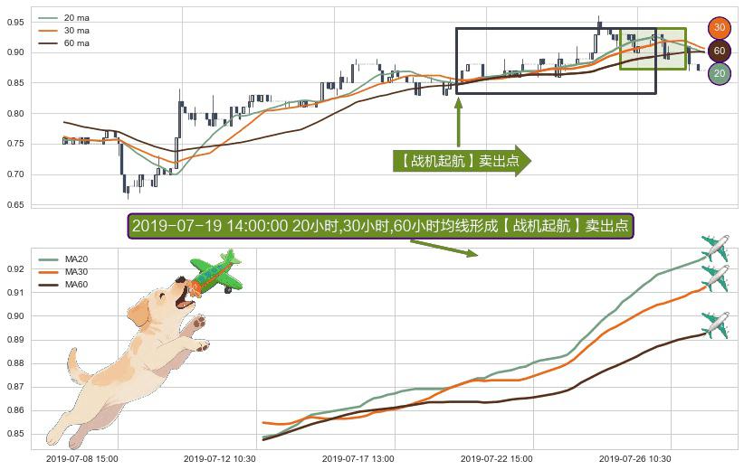 形态多维评估: ⚀ 2019-07-12 11:30:00小时-2019-07-29 09:30:00小时显现 20小时-30小时-60小时均线 【战机起航】卖出点 看空信号,后市看跌,卖出