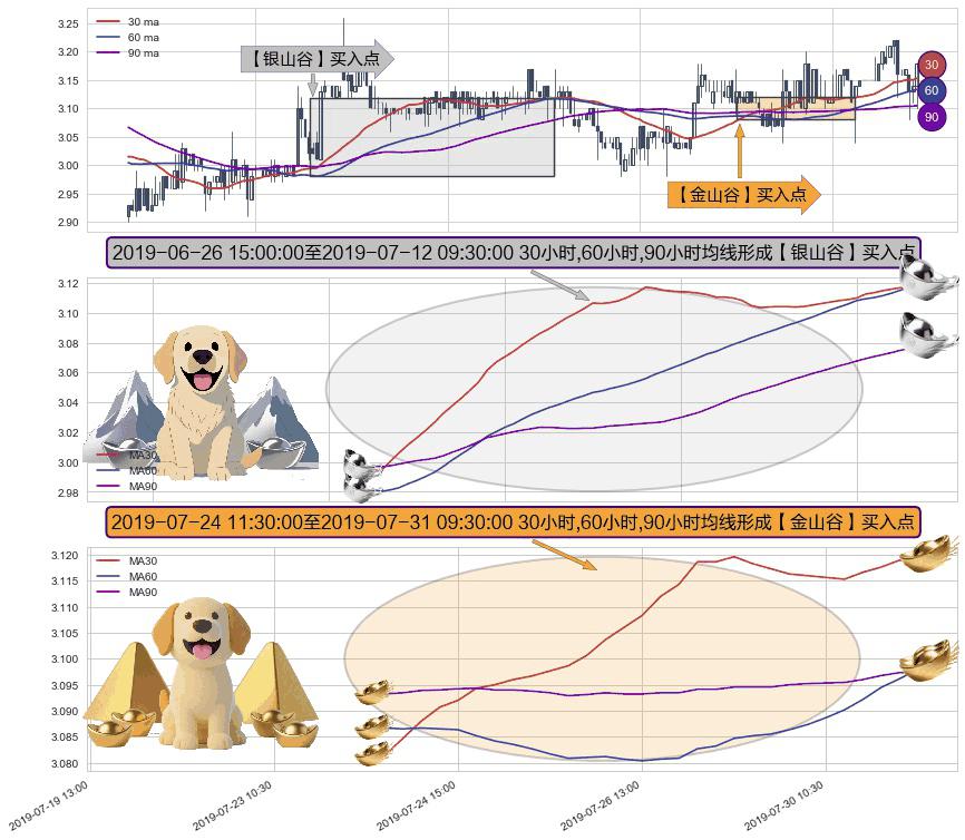 形态多维评估: ⚀ 2019-07-24 13:00:00-小时至2019-07-31 09:30:00-小时显现 30小时-60小时-90小时均线 【金山谷】买入点 其再次确认了买入信号,可靠性更强,买入