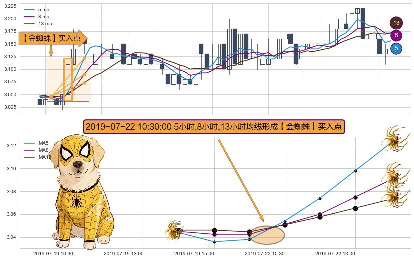 形态多维评估: ⚀ 2019-07-22 10:30:00小时显现 5小时-8小时-13小时均线 【金蜘蛛】买入点 看多信号,后市看涨,买入