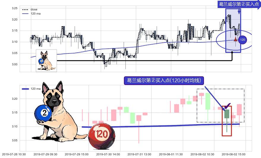 形态多维评估: ⚀ 2019-08-02 13:00:00-小时显现 葛兰威尔均线 120小时均线 第②买入点 上升趋势的中继信号,后市看涨,买进信号