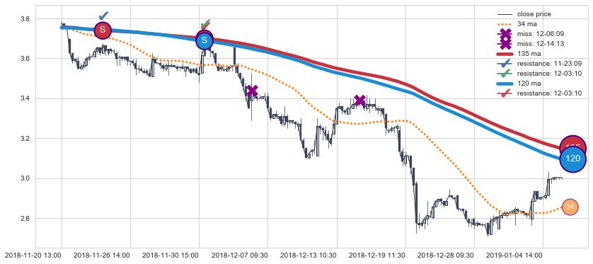 下跌趋势04-08 14:00-06-25 15:00,均线120, 135确认关键阻力4处