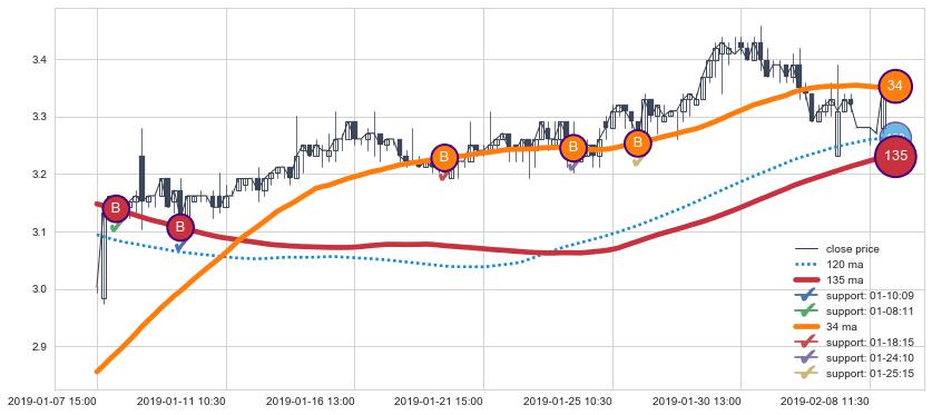 上涨趋势01-07 15:00-02-08 14:00,均线34, 135确认关键支撑5处