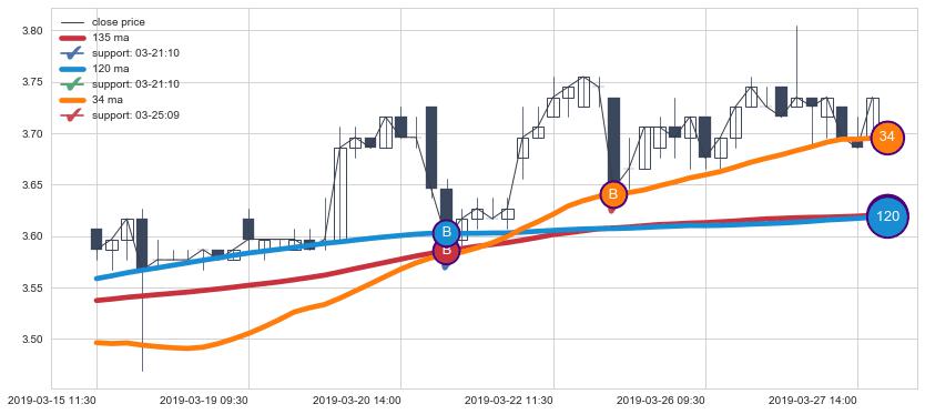 上涨趋势03-15 11:30-03-27 15:00,均线120, 34, 135确认关键支撑2处