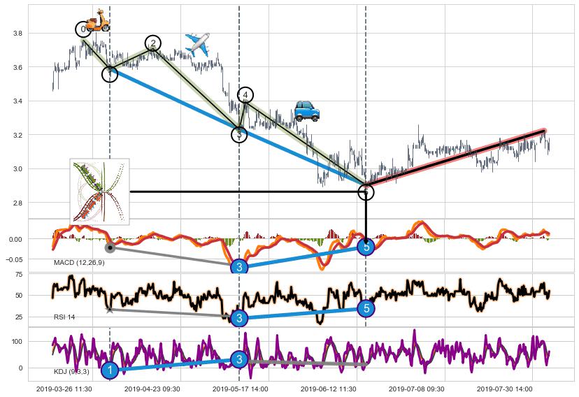 ➢ 1,3,5驱动浪MACD, RSI, KDJ走势都出现【常规背离】反转信号增强