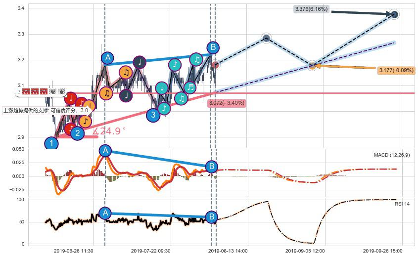♘ 在最后的上升阶段2019-06-14 10:30至2019-08-02 15:00存在 持续未破位的支撑位 ,支撑价格3.072,支撑可信任强度72.49%,其距离最后价格3.180相差 -3.40%