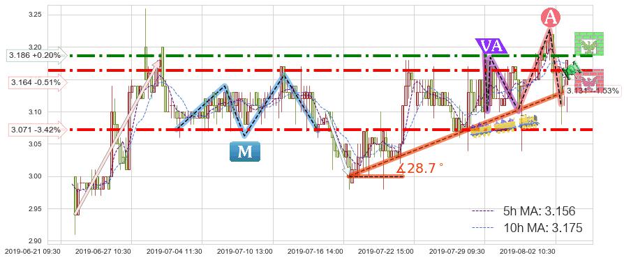 ♘ 阻力价格位3.186,可信任强度78.36%,距离最后交易2019-08-02 15:00形成的收盘价格3.180相差 +0.20%