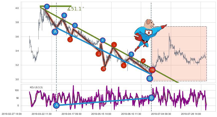 从2019-03-14 10:30至2019-06-24 10:30,共包含397个小时,阶段股价下跌-16.93%,阶段股价变动位移路程比: 1 : 13,下跌趋势角度: 51.1