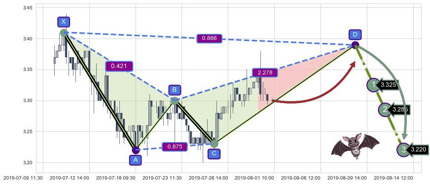 ➣ 未完成【蝙蝠】形态起点X: 07-10:15, 已到达C点: 07-25:14, 预测最终D点: 08-08:15, 共121交易小时