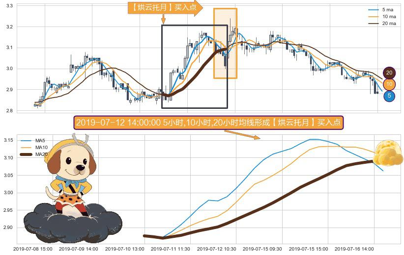 形态多维评估: ⚀ 2019-07-10 13:00:00小时-2019-07-16 15:00:00小时显现 5小时-10小时-20小时均线 【烘云托月】买入点 看多信号,后市看涨,买入