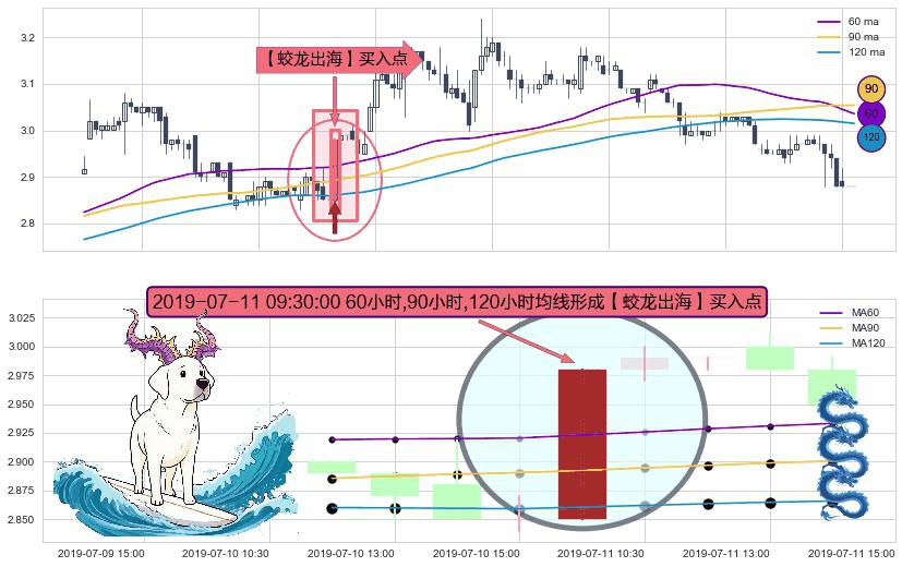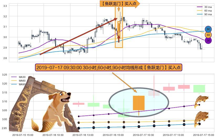 形态多维评估: ⚀ 2019-07-17 09:30:00小时显现 30小时-60小时-90小时均线 【鱼跃龙门】买入点 看多信号,后市看涨,买入