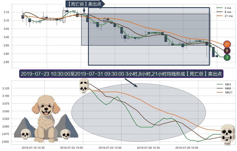 形态多维评估: ⚀ 2019-07-23 11:30:00-小时至2019-07-31 09:30:00-小时显现 3小时-8小时-21小时均线 【死亡谷】卖出点 看空信号,后市看跌,卖出