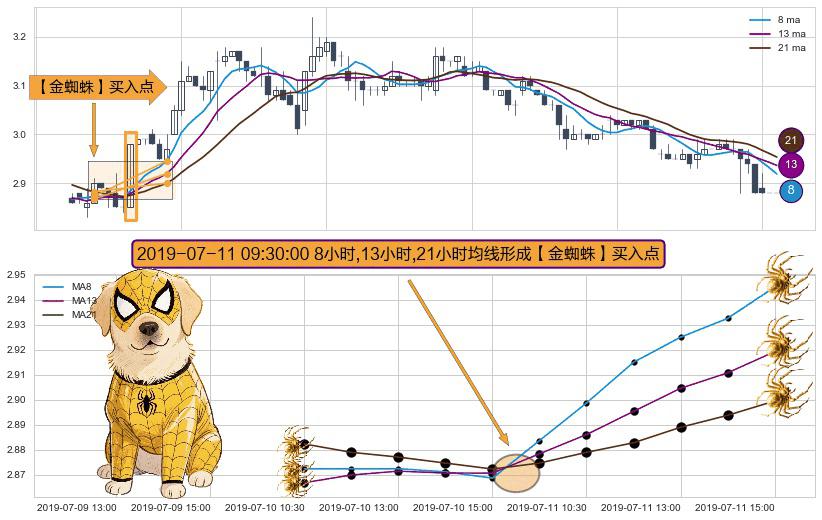 形态多维评估: ⚀ 2019-07-11 09:30:00小时显现 8小时-13小时-21小时均线 【金蜘蛛】买入点 看多信号,后市看涨,买入
