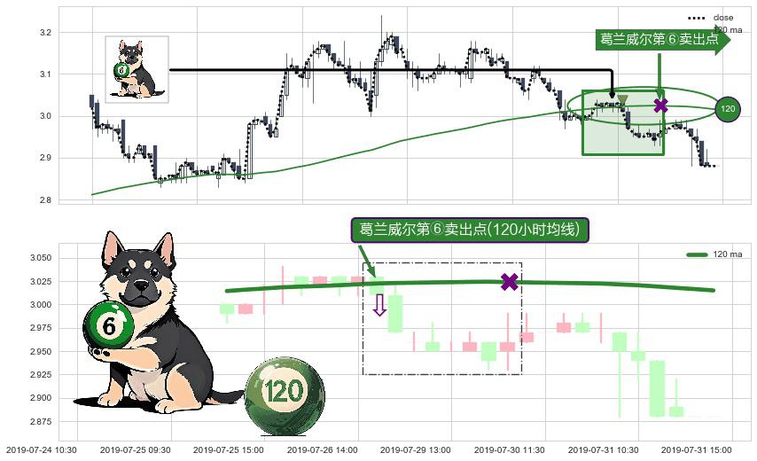 形态多维评估: ⚀ 2019-07-26 15:00:00-小时显现 葛兰威尔均线 120小时均线 第⑥卖出点 走势反转见顶信号,后市看跌,卖出信号
