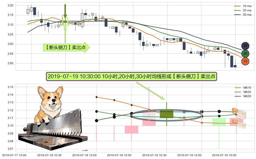 形态多维评估: ⚀ 2019-07-19 10:30:00小时显现 10小时-20小时-30小时均线 【断头铡刀】卖出点 看空信号,后市看跌,卖出