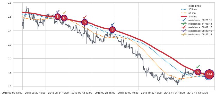 下跌趋势08-08 13:00-11-13 10:30,均线144确认关键阻力5处