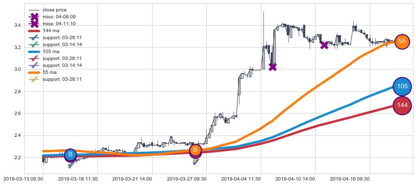上涨趋势03-13 09:30-04-17 13:00,均线144, 105, 55确认关键支撑2处