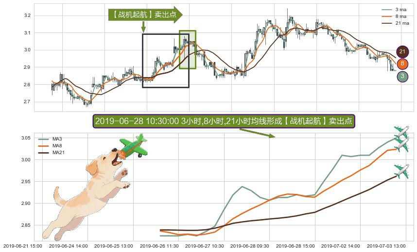 形态多维评估: ⚀ 2019-06-26 09:30:00小时-2019-07-03 11:30:00小时显现 3小时-8小时-21小时均线 【战机起航】卖出点 看空信号,后市看跌,卖出