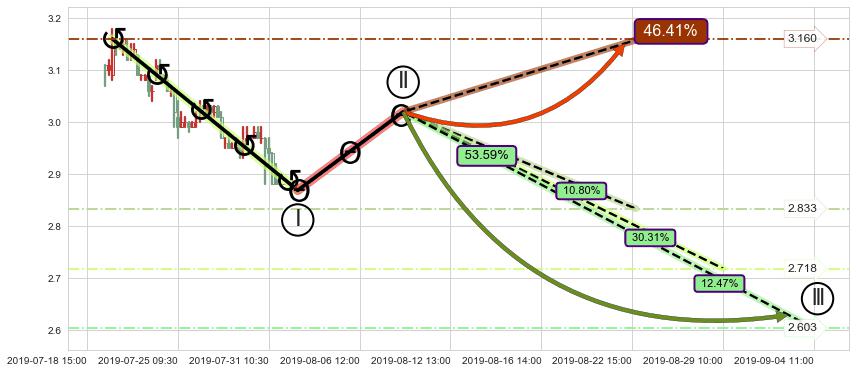 ➢ 预测:2019-08-05 12:00,【继续下探】稳定目前下跌趋势的前提下,预测价格:2.812