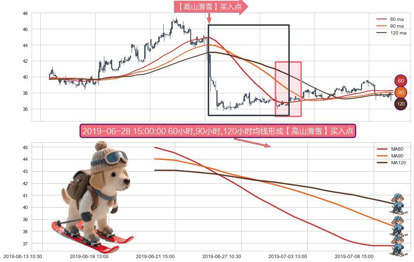 ⚀ 2019-06-20 15:00:00小时-2019-07-09 15:00:00小时显现 60小时-90小时-120小时均线 【高山滑雪】买入点 看多信号,后市看涨,买入
