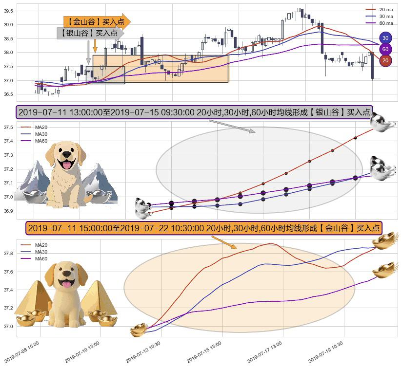 ⚀ 2019-07-12 09:30:00-小时至2019-07-22 10:30:00-小时显现 20小时-30小时-60小时均线 【金山谷】买入点 其再次确认了买入信号,可靠性更强,买入