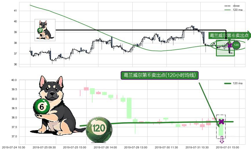 ⚀ 2019-07-31 13:00:00-小时显现 葛兰威尔均线 120小时均线 第⑥卖出点 走势反转见顶信号,后市看跌,卖出信号