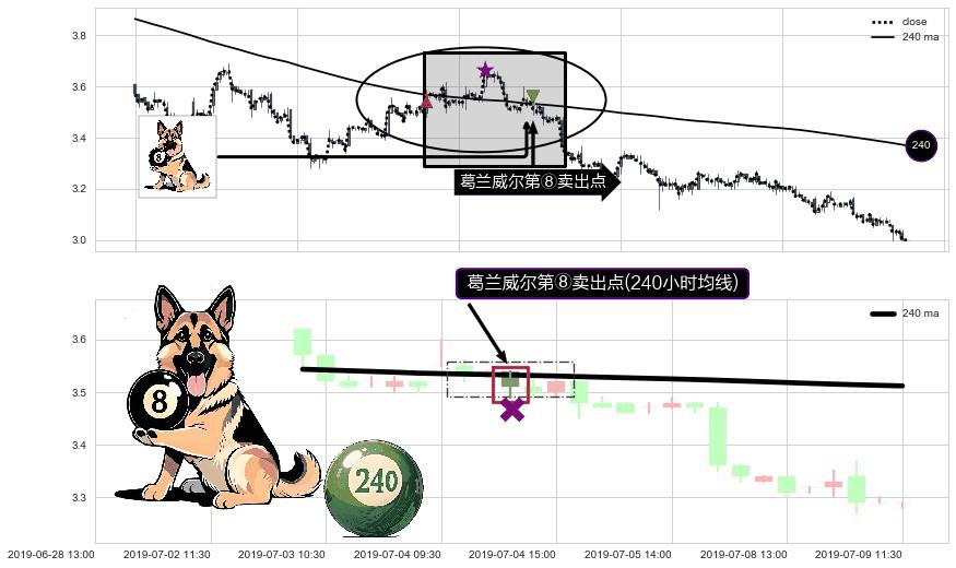 形态多维评估: ⚀ 2019-07-04 13:00:00-小时显现 葛兰威尔均线 240小时均线 第⑧卖出点 下降趋势的中继信号,后市看跌,卖出信号