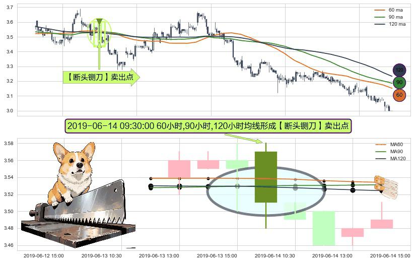形态多维评估: ⚀ 2019-06-14 09:30:00小时显现 60小时-90小时-120小时均线 【断头铡刀】卖出点 看空信号,后市看跌,卖出