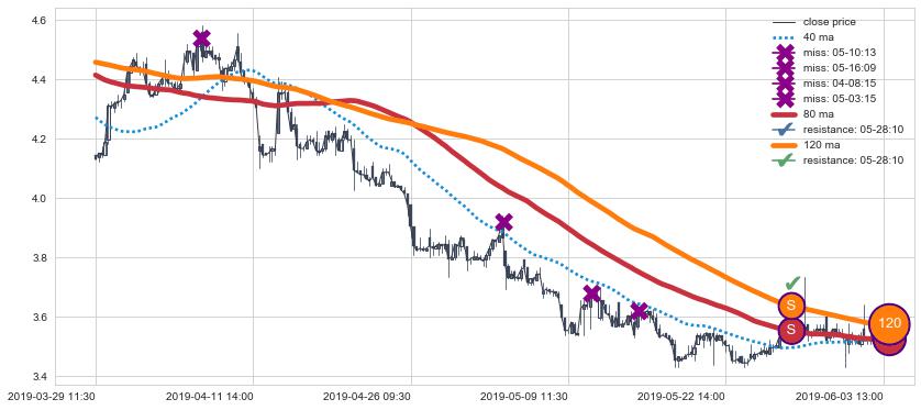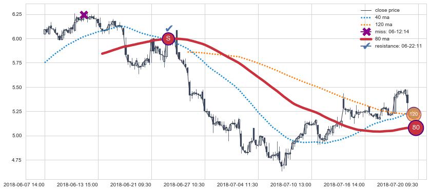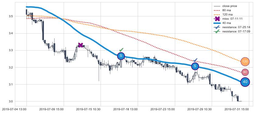 下跌趋势07-04 13:00-07-31 15:00,均线40确认关键阻力2处