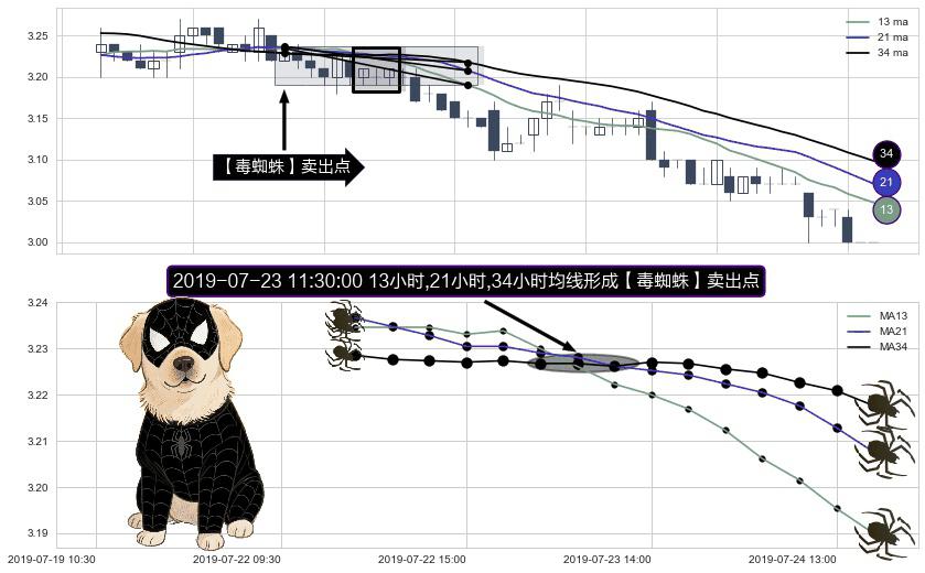 形态多维评估: ⚀ 2019-07-23 11:30:00小时显现 13小时-21小时-34小时均线 【毒蜘蛛】卖出点 看空信号,后市看跌,卖出
