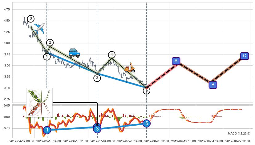 ➣ 第一, 三, 五浪下跌动能逐渐【衰弱变小】,趋势呈现不稳迹象