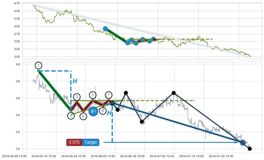 从2019-05-23 13:00至2019-07-02 09:30,共包含154个小时,阶段股价上涨6.54%,阶段股价变动位移路程比: 1 : 12