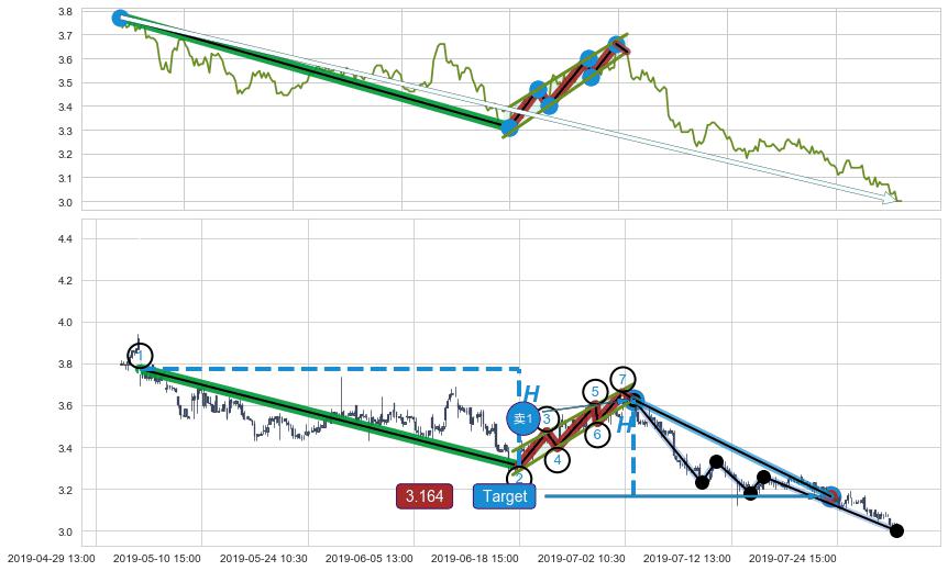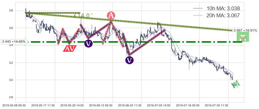 2019-05-23: 第一阻力位3.440有效抑制了下跌浪,成功阻止了价格的继续下跌。