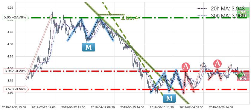 ♘ 支撑价格位3.573,可信任强度96.05%,距离最后交易2019-07-31 15:00形成的收盘价格3.950相差 -9.56%
