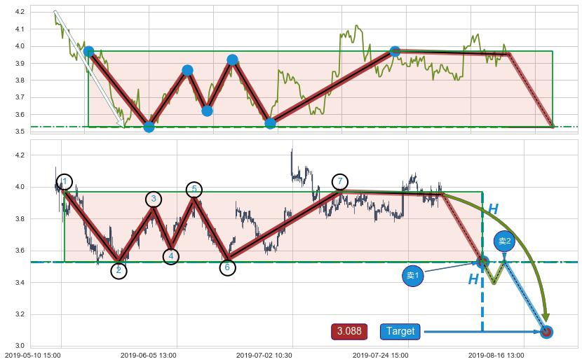 从2019-05-30 13:00至2019-06-14 14:00,共包含62个小时,阶段股价下跌-5.66%,阶段股价变动位移路程比: 1 : 7