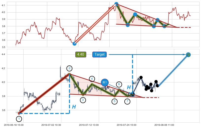 ➣ 最小中继整理跌幅→𝐇: 0.44100 (上平行阻力线与下平行支撑线的垂直距离)