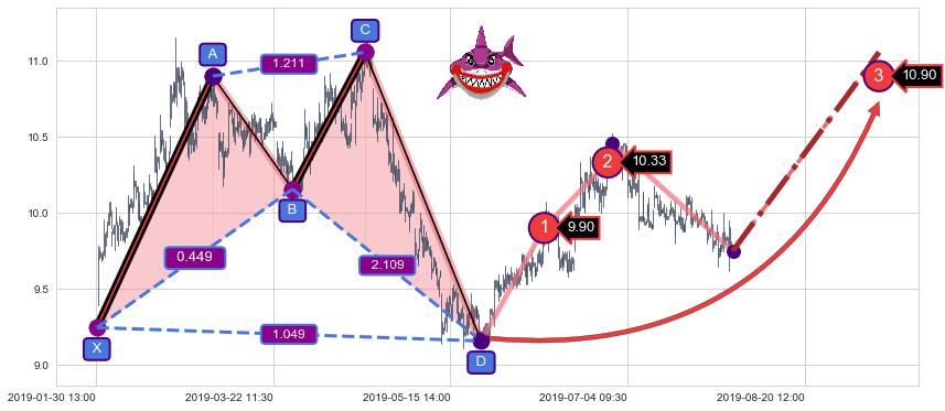 ➣ 已完成【鲨鱼】形态起点X: 01-30:14, 终点D: 05-23:13, 共435交易小时