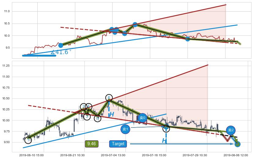 从2019-06-28 10:30至2019-07-31 09:30,共包含132个小时,阶段股价下跌-6.74%,阶段股价变动位移路程比: 1 : 6,下跌趋势角度: 38.7