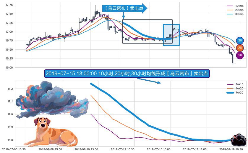 形态多维评估: ⚀ 2019-07-10 10:30:00小时-2019-07-18 15:00:00小时显现 10小时-20小时-30小时均线 【乌云密布】卖出点 看空信号,后市看跌,卖出