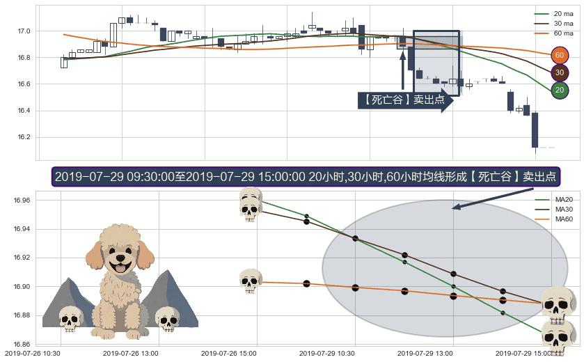形态多维评估: ⚀ 2019-07-29 10:30:00-小时至2019-07-29 15:00:00-小时显现 20小时-30小时-60小时均线 【死亡谷】卖出点 看空信号,后市看跌,卖出