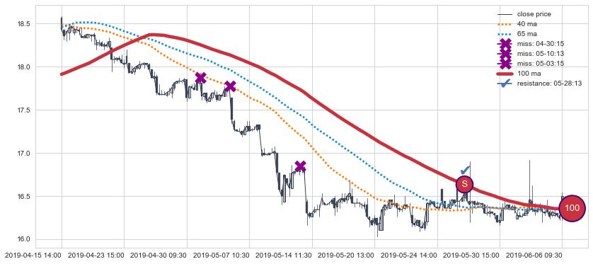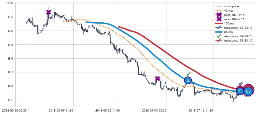 下跌趋势05-28 09:30-07-23 15:00,均线65, 100确认关键阻力2处