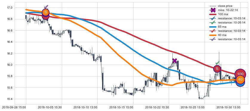 下跌趋势09-28 15:00-10-30 13:00,均线40, 65, 100确认关键阻力2处