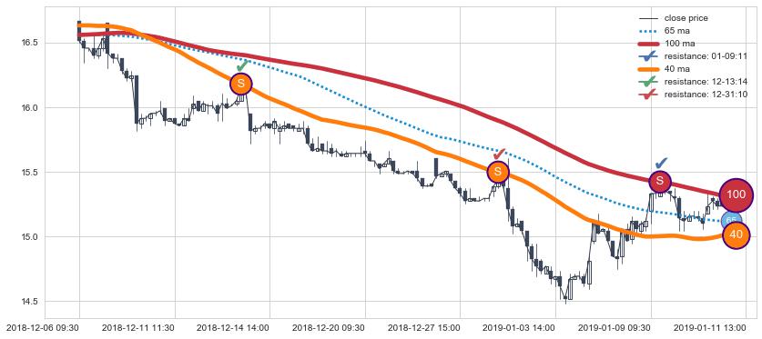 下跌趋势12-06 09:30-01-11 13:00,均线40, 100确认关键阻力3处
