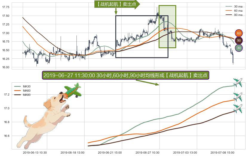 形态多维评估: ⚀ 2019-06-18 15:00:00小时-2019-07-08 15:00:00小时显现 30小时-60小时-90小时均线 【战机起航】卖出点 看空信号,后市看跌,卖出