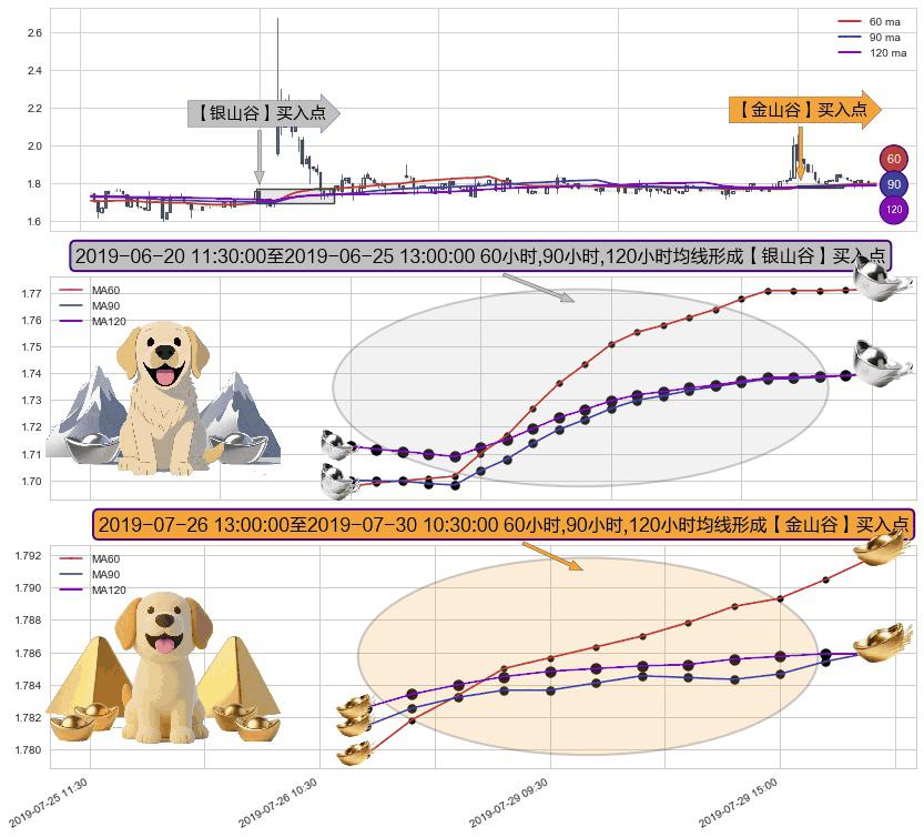 ⚃ 2019-07-26 14:00:00-小时至2019-07-30 10:30:00-小时显现 60小时-90小时-120小时均线 【金山谷】买入点 其再次确认了买入信号,可靠性更强,买入
