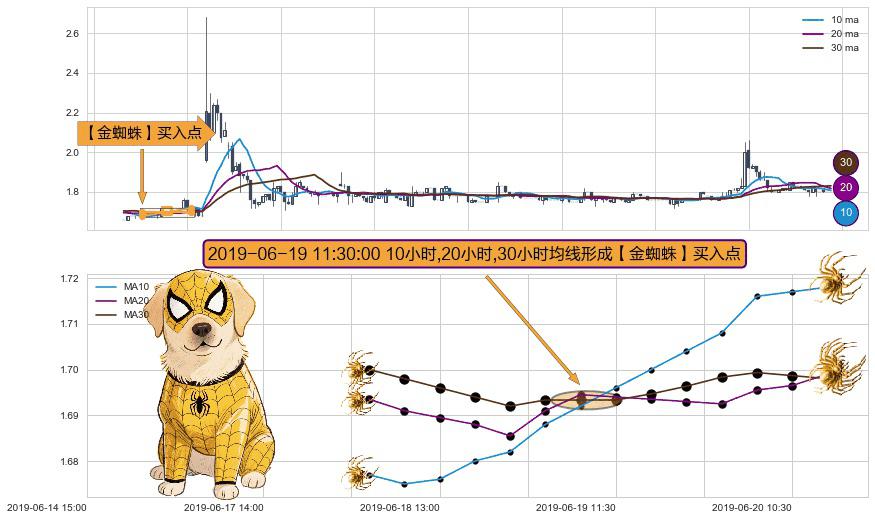 ⚀ 2019-06-19 11:30:00小时显现 10小时-20小时-30小时均线 【金蜘蛛】买入点 看多信号,后市看涨,买入