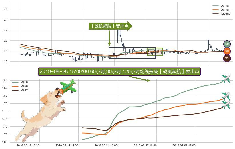 ⚀ 2019-06-18 15:00:00小时-2019-07-05 15:00:00小时显现 60小时-90小时-120小时均线 【战机起航】卖出点 看空信号,后市看跌,卖出